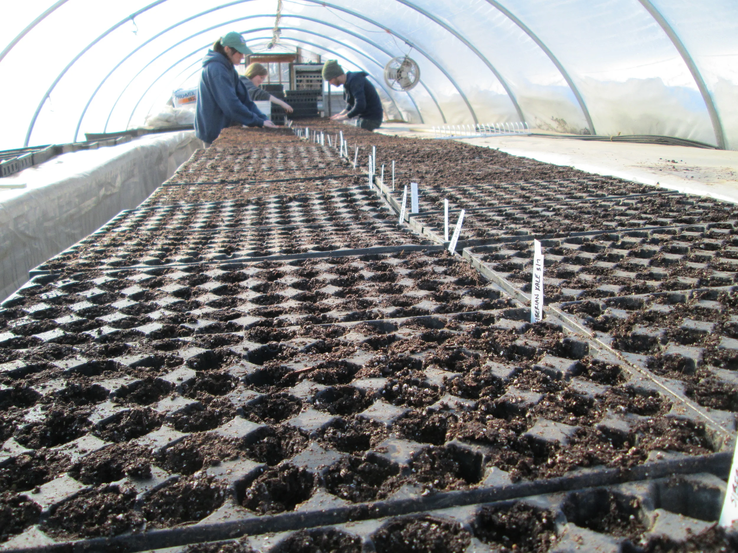 The green house is FULL! We have many kinds of broccoli, cabbage, collards, eggplant, kale, kohlrabi, leeks, lettuce, onions, peppers, spinach, swiss chard, and tomatoes seeded, germinating, and ready for frost free in one month! We started shaping some raised beds in the high tunnel and direct sowed lettuce, spinach, arugula, scallions, carrots, radishes, beets, and turnips. We used a broad fork, hoe, garden rake, and Johnny's Bed Preparation Rake with Row Markers to make nice, loose, even rows with accurate spacing. The Jang JP-1 seeder was so great for precision seeding, simple and efficient for us physically and to save our seeds for where we want them so they can have a healthy, happy life.