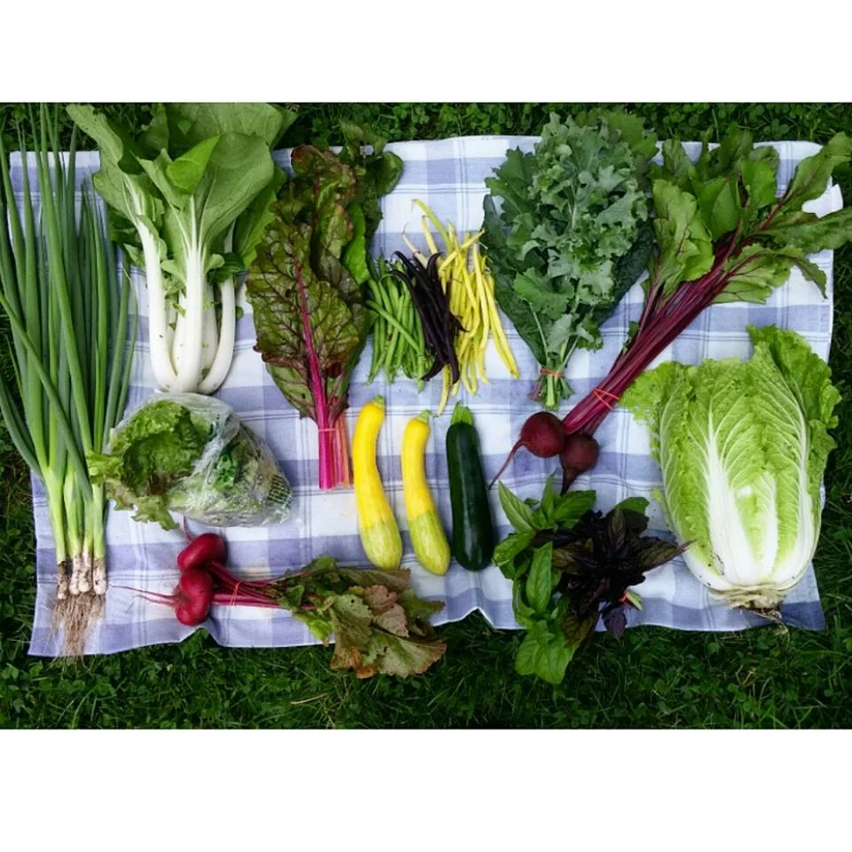 9oz Bunch of Mixed Kale. One large Patty Pan squash. Two Seedless Cucumbers. 1lb Bunch of Carrots w/ Tops. One Marketmore Slicing Cucumber. Three Pickling Cucumbers. Two Purplette Fresh Onions. One Zucchini. One Heirloom Tomato (3/4 lb average weight). One bunch of Beets w/ Tops. One large Summer Squash. One heaping Quart of mixed Beans (Yellow Wax, Green and Purple). One large "pesto" sized Bunch of Purple and Green Basil. Cilantro. Mint. Zinnia and Marigold Flowers.